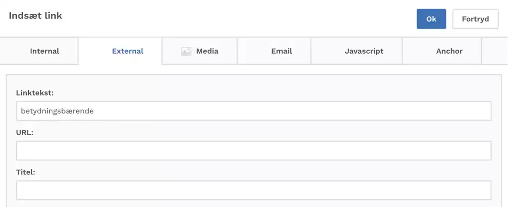 Hvis du vælger at skive et ikke-sigende link og derfor gerne vil skrive en alternativ tekst, gør du det ved at udfylde feltet "Titel" i link-editoren: